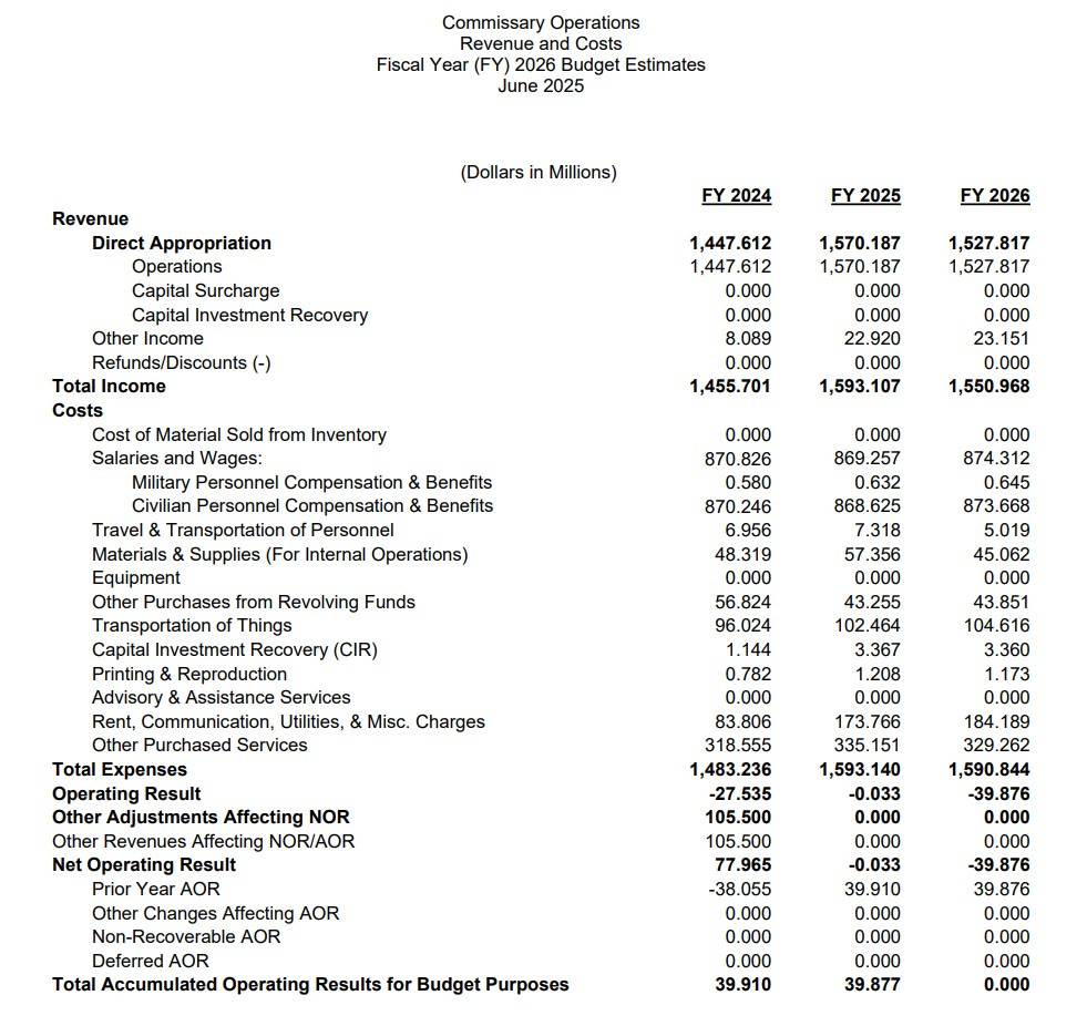 Because they operate at a loss, the Defense Commissary Agency covers operating and capital costs through two major sources: annual appropriations from Congress and a 5 percent surcharge on patron sales. Revenue from actual sales goes into a “Resale Stocks” account where it’s used to restock the stores. Despite this somewhat odd system, relative to one’s mental image of how a private grocery store might work, we still have numbers on how much DeCA sells and spends every year: